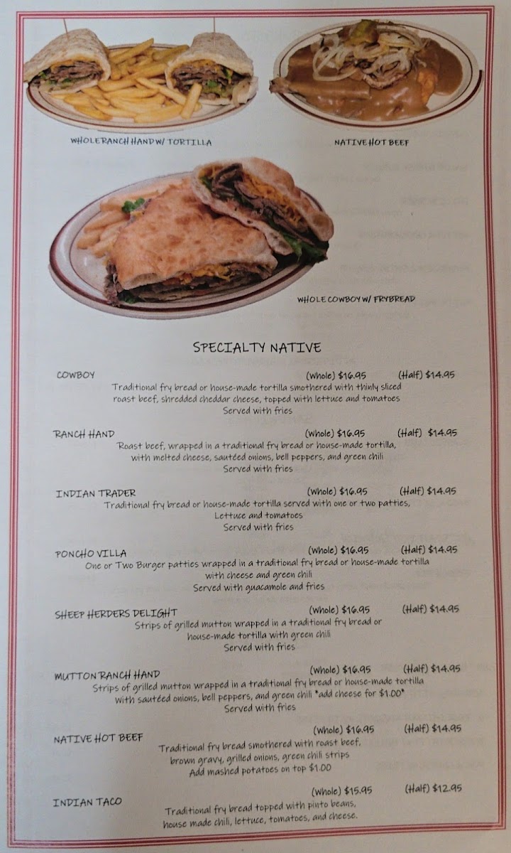 Highlighting its specialty Native offerings, the Cowboy and Ranch Hand wraps are a must-try, combining tender roast beef with fresh veggies, all enveloped in warm fry bread or housemade tortillas. These dishes, priced at $14.95, reflect the cafe's dedication to cultural flavors.